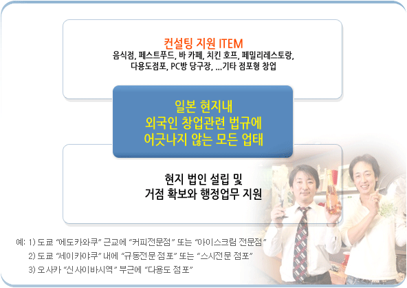 | [주]OJT FC에서는 한국에서 일본으로 진출하는 고객에 대해 전문 컨설턴트를 현지 동행하여 사전시장조사, 재류자격, 회사설립,